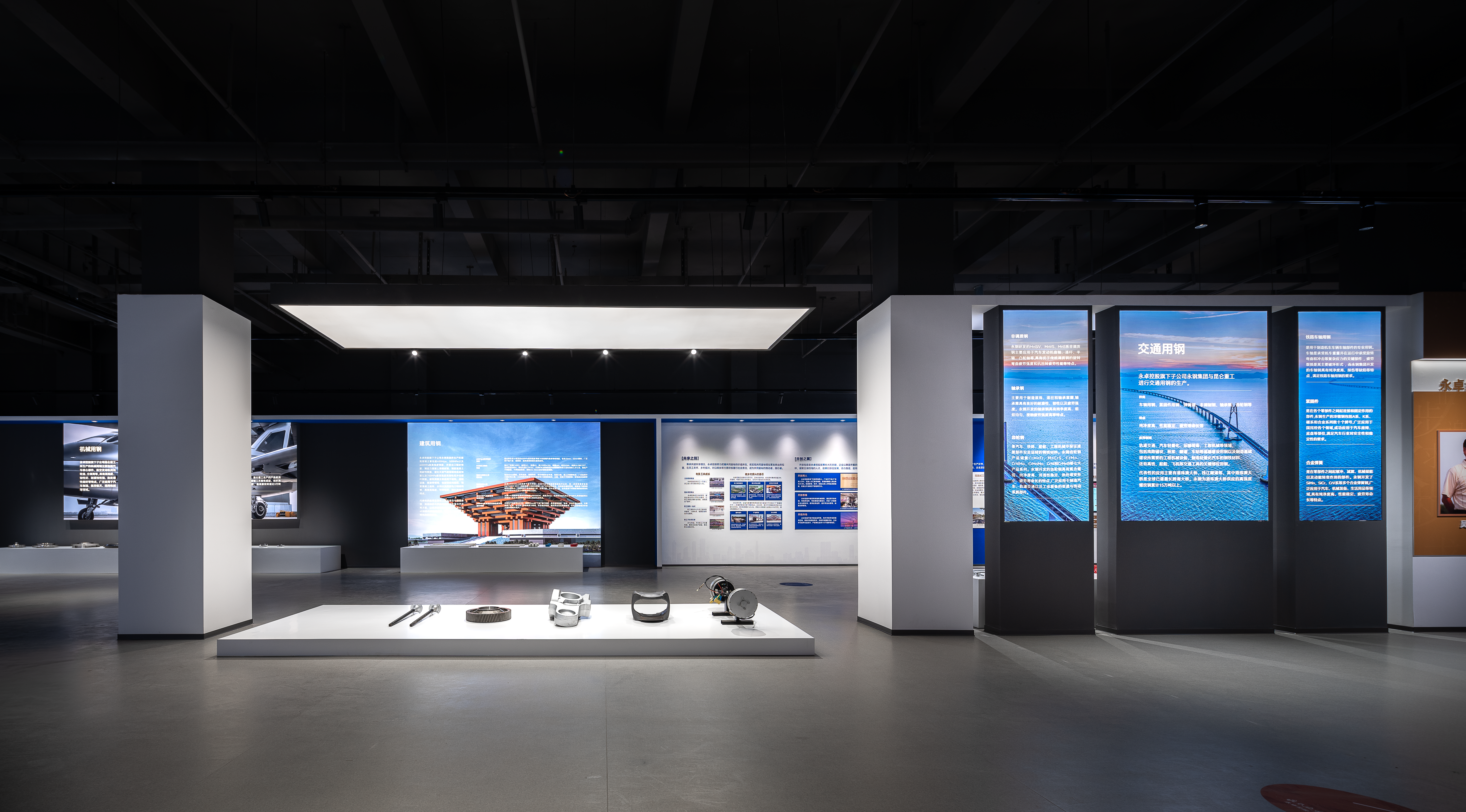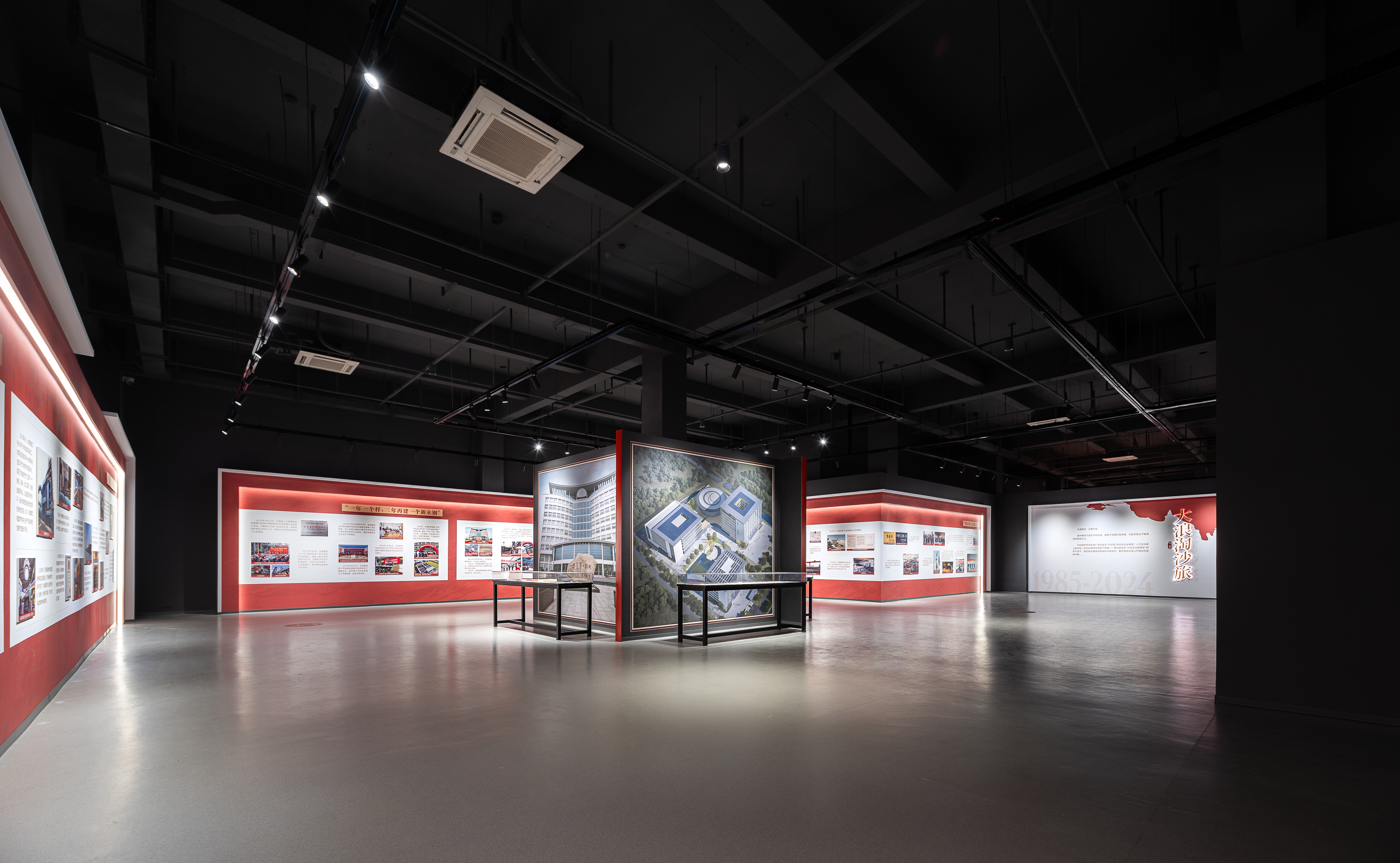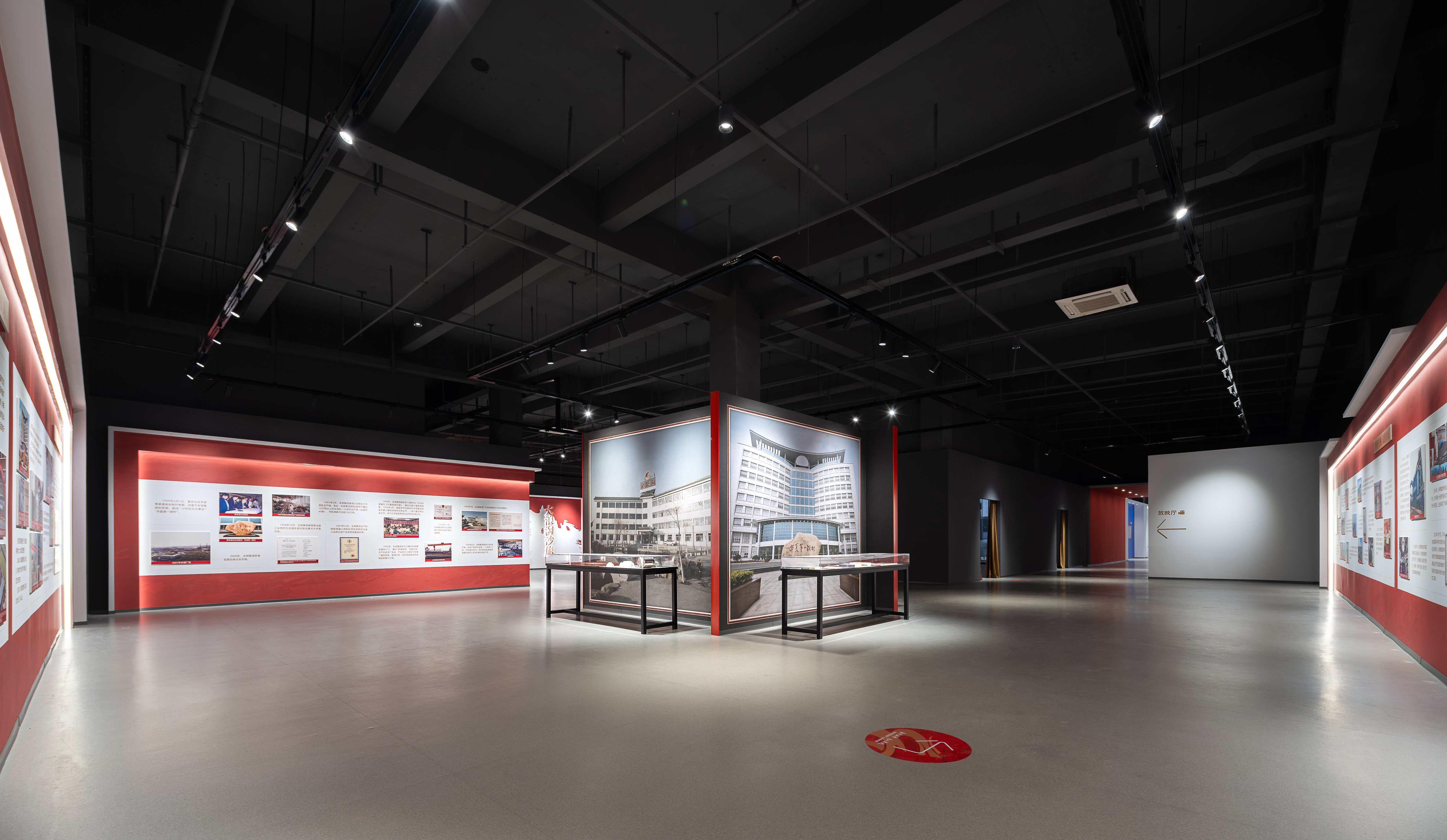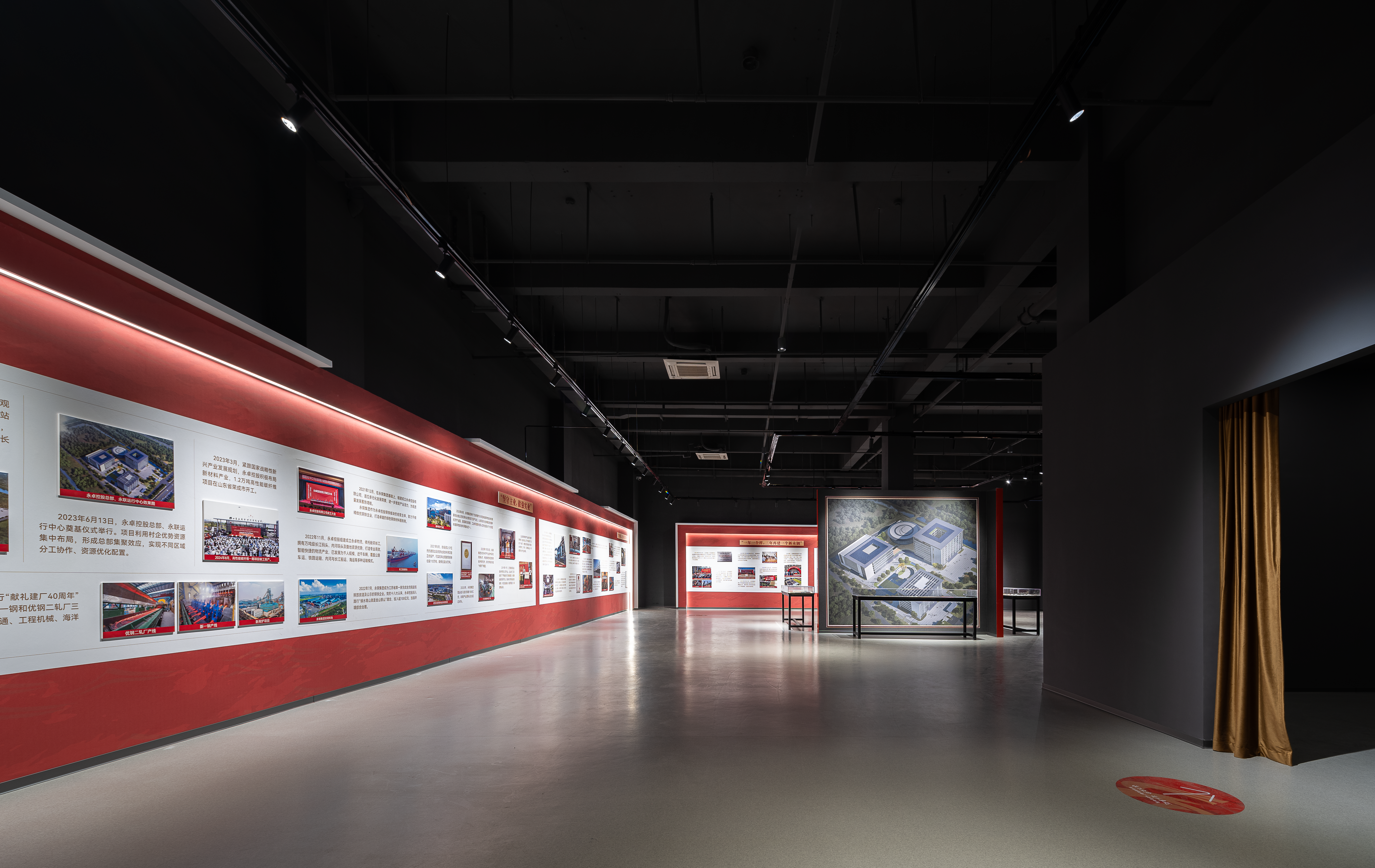 40年奋斗历史,五大故事篇章,穿插特展形式,主次展示要点分明有序,让参观者在参观的同时逐步深入了解永卓控股。整体设计形象思考,结合40周年logo图形,将“红、蓝、金”三色进行提炼与运用,串联起展厅画面叙事空间。空间选材大面积采用哑光、镜面、通透、金属等质感,构建出展厅整体的工业风格与艺术氛围,让参观者行走于这一方天地之间,可触摸到过去,也可以看到未来。