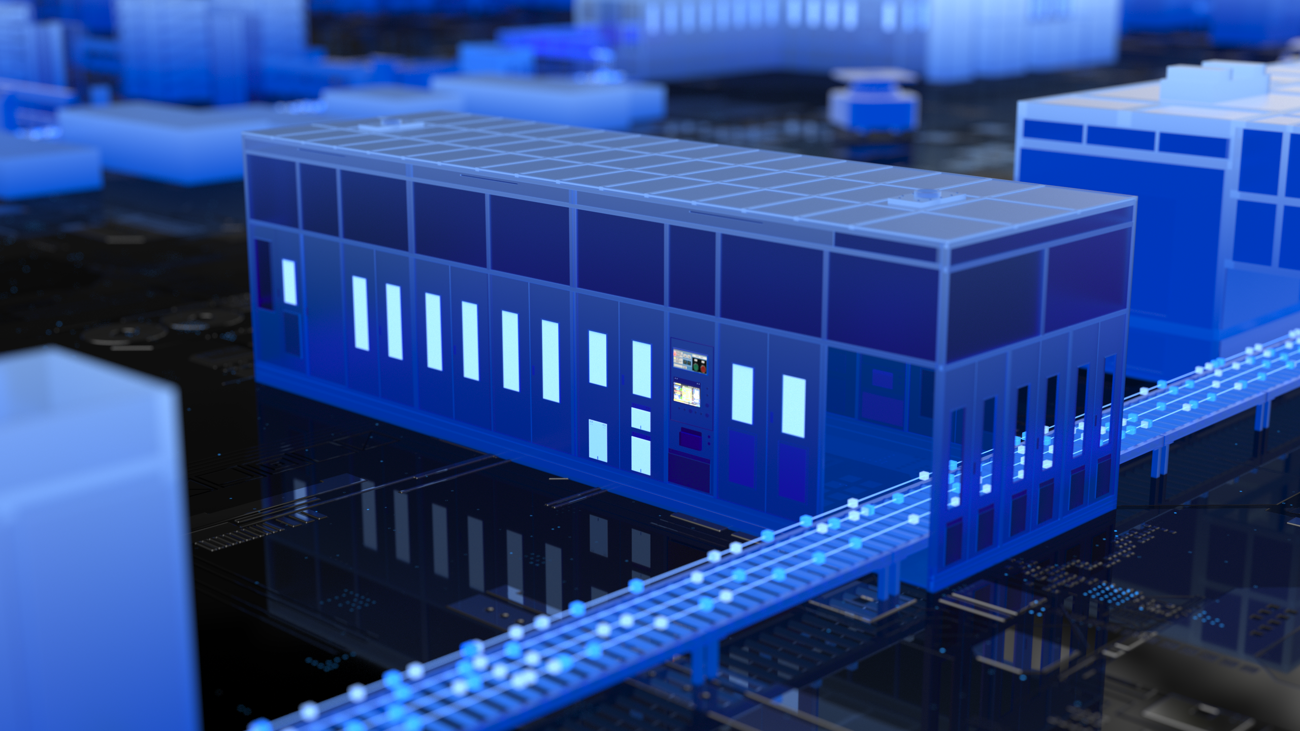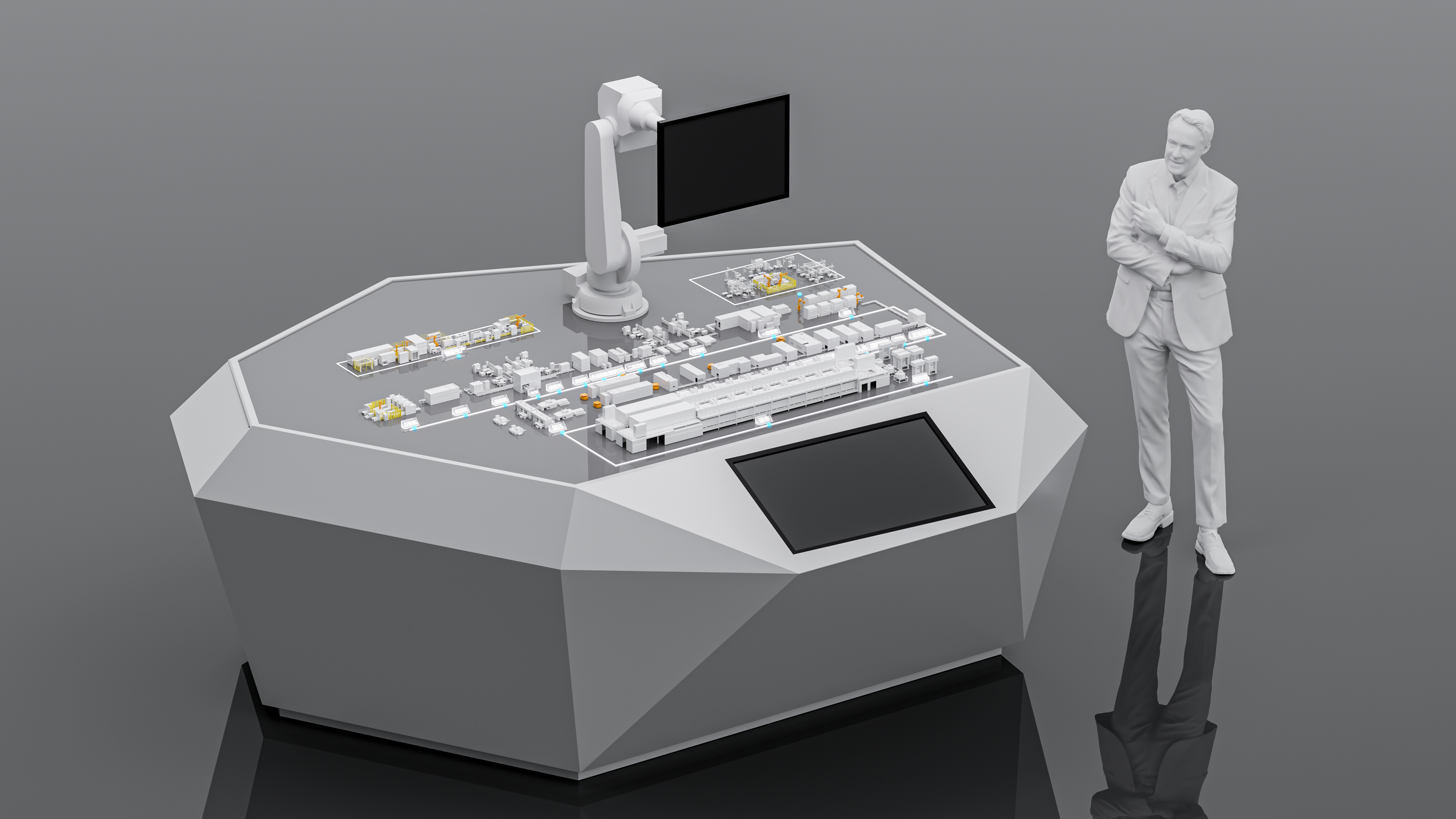 In the exhibition hall, the lithium battery production line interaction system combines robotic arm control, sand table models, digital twins, and embedded development. Using UE4's real-time rendering, the production line is showcased through animations. Users can interact via protocols like HTTP and TCP/IP with a C++ scheduling controller, enabling coordination among the UE interface, robotic arms, multi-screen displays, and LCD light strips. This enhances the display effect and increases audience engagement.